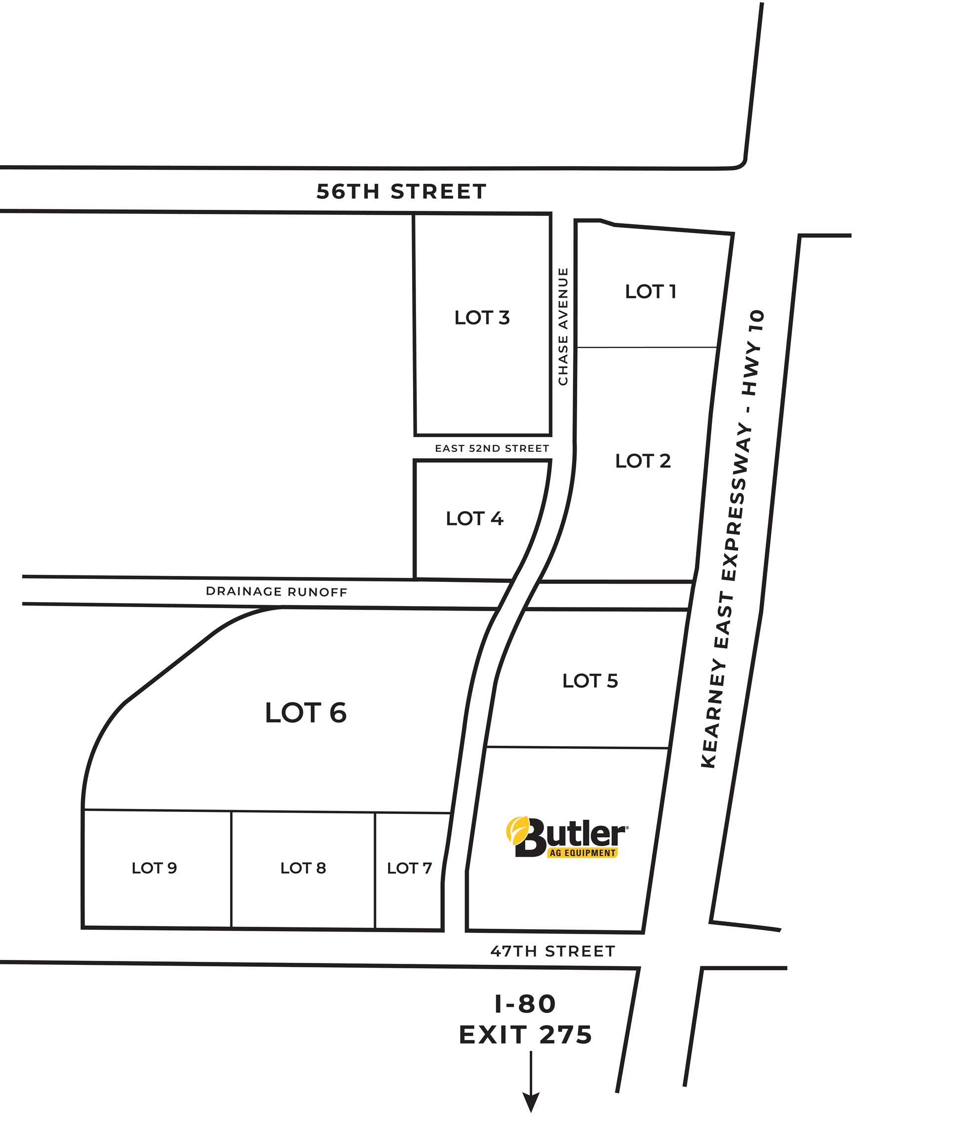 Developing area ready for your business! Join Butler Ag in their new Butler Addition on the east side of Kearney. This development is located in the southwest corner of 56th Street and Kearney Expressway-Hwy 10. This commercial development is near Kearney Regional Airport, Kearney’s Patriot Park (Sports Complex), Central Nebraska Veterans Home, Farm Credit Services of America and Butler Ag Equipment. The entire development will be rezoned to Business Park(BP). Property will need to go in front of the Kearney City Council for final platting and rezoning. Excellent access to I-80. City utilities are available along Chase Avenue. Buyer is responsible for all connection cost. Flexible lot sizes. 2-34 Acres, the price for this location is based on a $1.75/ sq ft price. Map is for illustration purposes only. Call for more details.