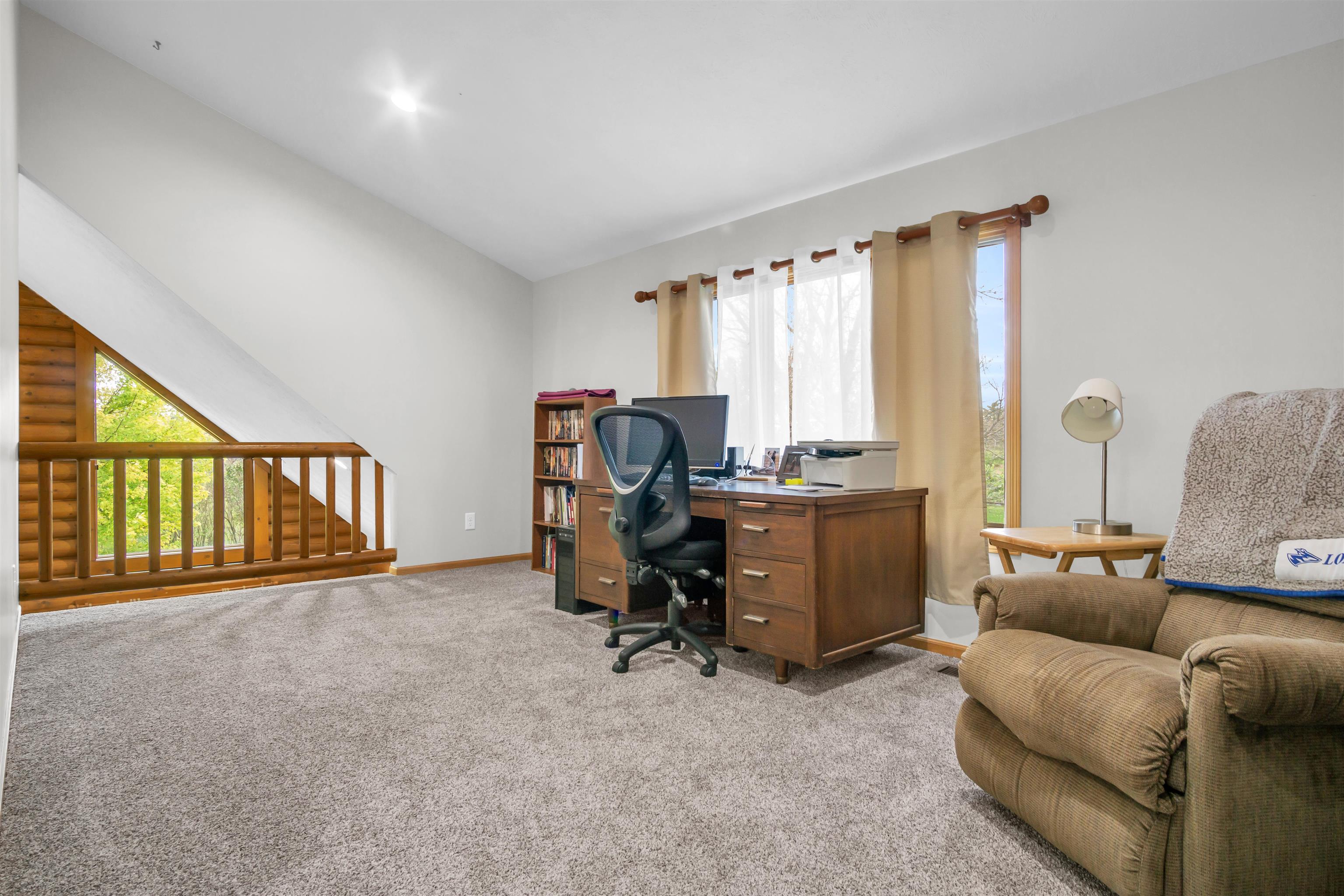Dreaming of log cabin living? This beautiful 4-bed, 3-bath home sits on 26 peaceful acres just north of Riverdale. Built in 2000, it features an attached 2-car garage plus a detached shop/garage. Enjoy serene landscaping, mature trees, and wide-open views and plenty of room to roam. Whether you’re sipping coffee on the back deck watching wildlife, or taking the dogs for a morning run, this property offers a true retreat from everyday living! Recent updates include a new roof and gutters (Aug. 2025), new carpet and LVP flooring, fresh interior paint, updated lighting, a newly painted deck, new refrigerator, and storm door. This property offers the rare combination of space, privacy, and comfort; all within a short drive from Kearney! Come experience the charm and craftsmanship of log cabin living at its finest!
